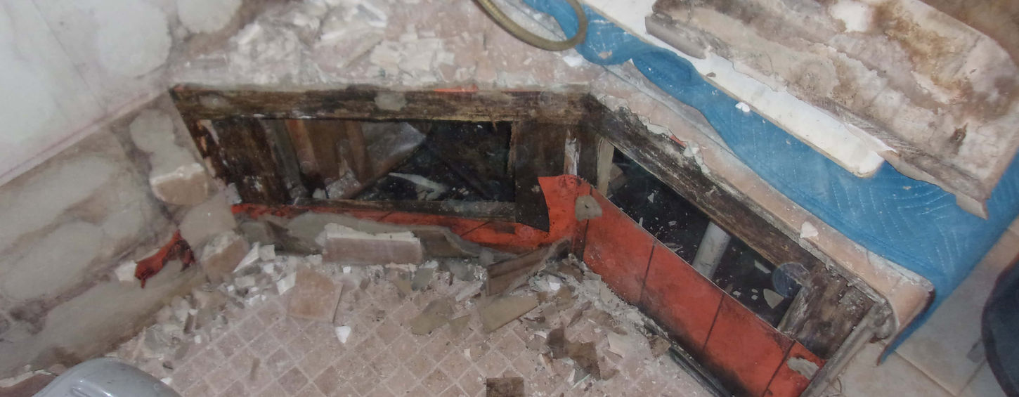 A shower faucet valve leaked behind the wall for an unknown time, and by the time the customer noticed it, water had spread between the finished flooring and subfloor. The water went throughout the primary bath, ½ of primary bedroom, entire kitchen, and entryway.