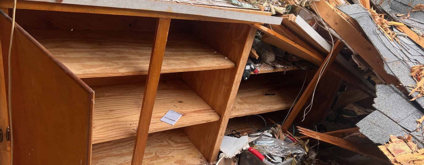 A very big oak tree crashed down through three other pine trees and hit the attached garage, causing the garage to shift off its foundation down the hill.